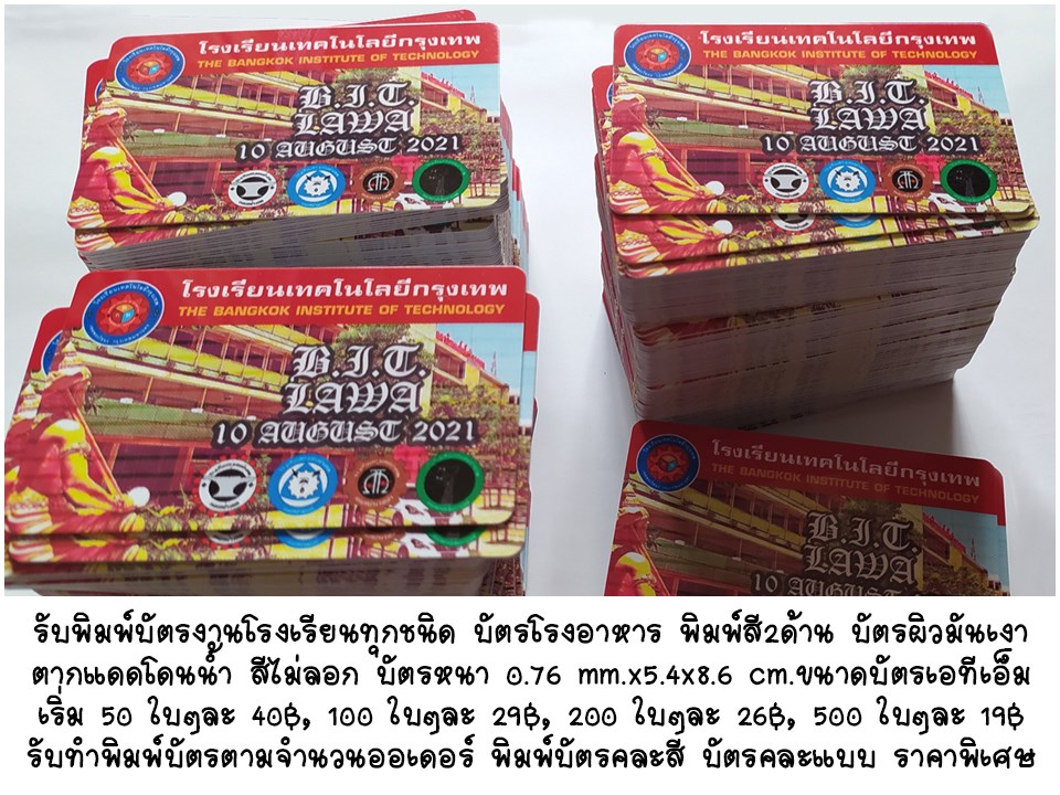 รับพิมพ์บัตรงานโรงเรียนทุกชนิด ทำบัตรโรงอาหาร พิมพ์บัตรเลี้ยงรุ่น พิมพ์บัตรคืนสู่เหย้า ทำบัตรจัดงานสังสรร บัตร Open House ผลิตบัตรแข็งจากวัสดุพลาสติก Card Pvc รับทำพิมพ์บัตรตามจำนวนออเดอร์ พิมพ์บัตรเร็ว พิมพ์บัตรถูก พิมพ์บัตรสวย พิมพ์บัตรจำนวนน้อย