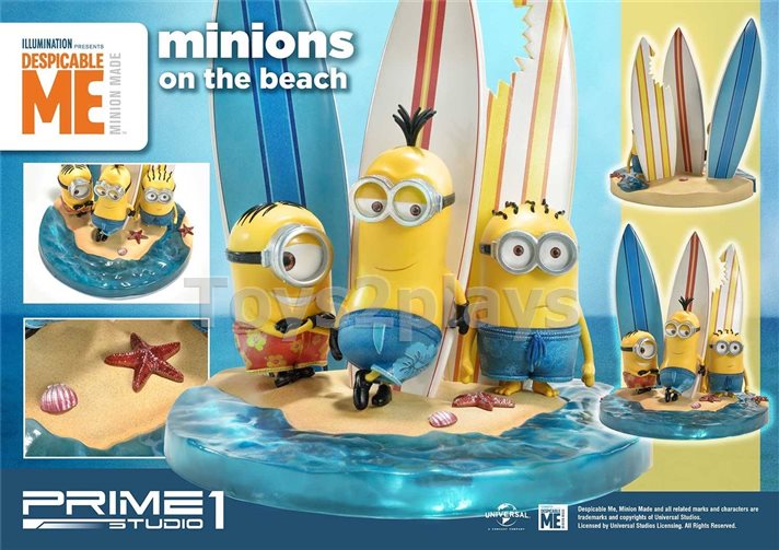 Prime 1 Studio is proud to present the first figures of the series PCFMINI-01: Minions on the beach from Despicable Me & Minions series. The Minions are small, yellow, cylindrical creatures, who have one of two eyes. They are the signature characters of the Despicable Me series. They bring much of the comedy in the film, and they are known as the scene-stealer of the movie. Frequently, they speak in an incomprehensible language, called Minionese, occasionally switching to English. The Minionsstanding approximately 9.25 inches tall featuring Stuart, Kevin and Tom with their Surfboard ready to surf on the beach. Don’t miss out to add the Minions in your Despicable Me & Minions series collection.