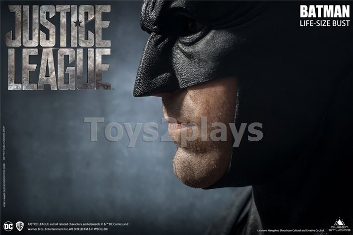 The 1:1 Batman bust captures Ben Affleck’s portrayal from the 2017 Justice League movie. His head is predominantly made of two materials. His cowl is made of polystone, while his strong jawline is made of top-grade silicone with a rooted stubble. And the eyes are made of glass, you can even see the eyelashes on the eyes.