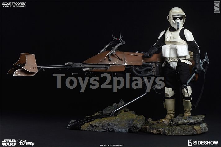 Armed to provide rear-guard cover with their blaster and sniper rifle, the Scout Troopers are trained as efficient survivalists, equipped with lightweight armor, utility belt, sidearm boot holster, and helmets with enhanced macrobinocular view plates for efficient target acquisition. Displayed with a forest terrain base, or piloting the Sixth Scale Imperial Speeder Bike (sold separately), these loyal scouts are ready to be assigned to their post.